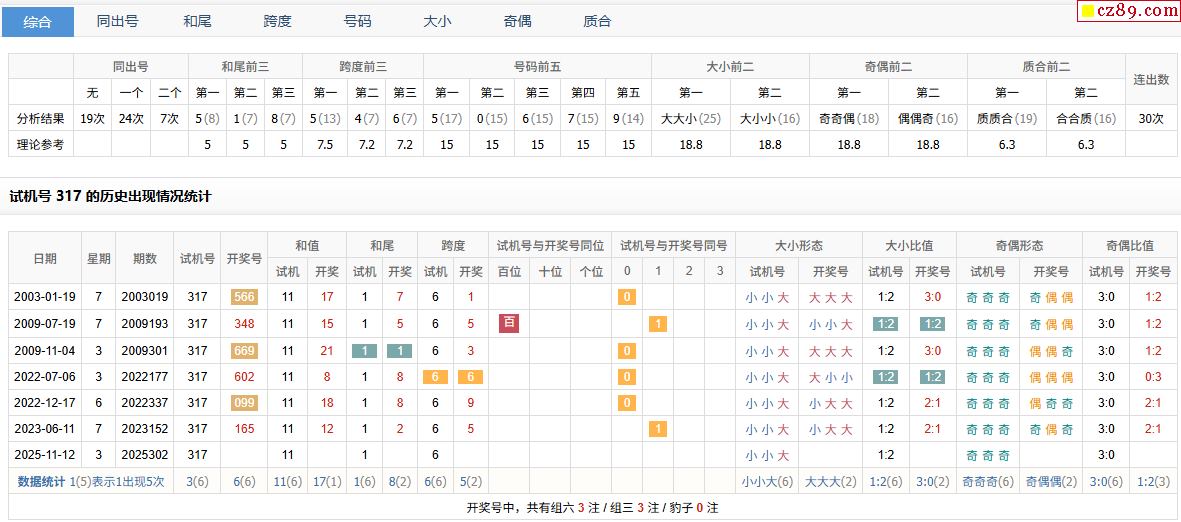 302期福彩3D试机号317对应开奖号的组选分析结果
